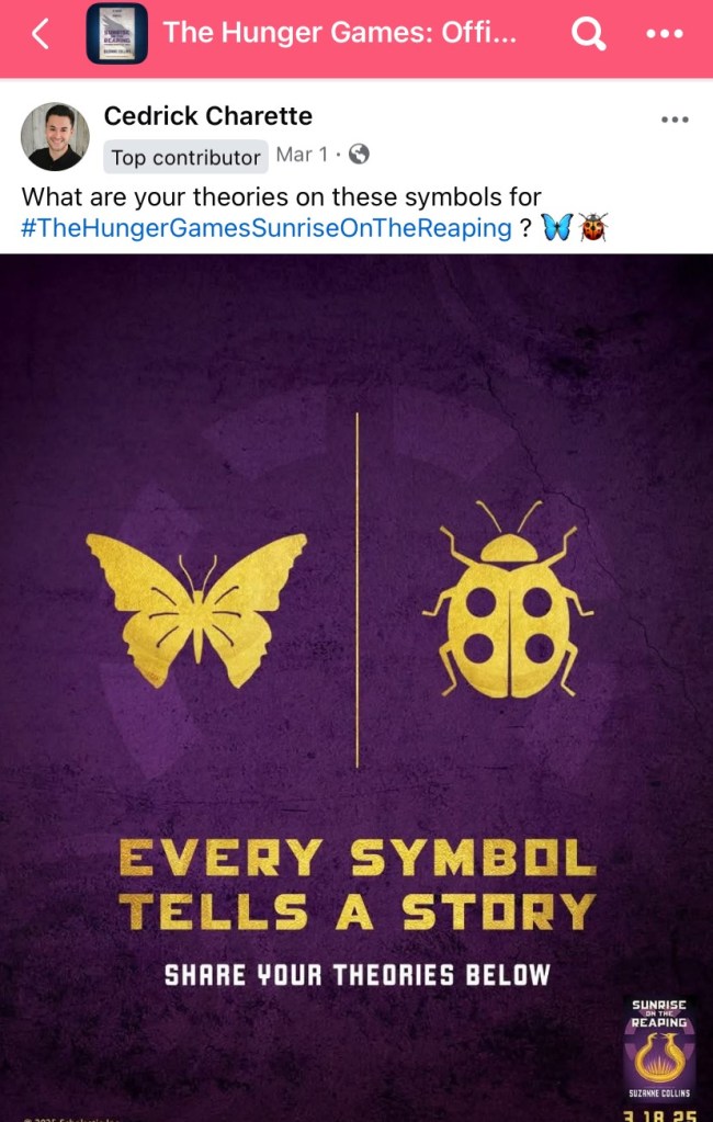 What’s up with butterflies and ladybugs? Recently a fan posted this promotional image below (apparently from the Sunrise Amazon page) with what seems to be a butterfly and ladybug separated by a solid line. Fans are speculating (quite correctly, I would think) that these have something to do with the temptingly friendly forest friends in the 50th Games that turn out to be all sorts of deadly. However, I discovered this quote upon a re-read of The Hunger Games. On page 78, Katniss and Peeta are trying to cover for Katniss’ recognition of an Avox she once saw trying to escape through the woods. Peeta covers for her by suggesting the Avox looked like Delly Cartwright. Still confused by this comparison, Katniss tells us that “Delly Cartwright is a pasty-faced, lumpy girl with yellowish hair who looks about as much like our server as a beetle does a butterfly. She may also be the friendliest person on the planet…” Upon a quick internet search, it is clear that a ladybug is just one type of beetle (they are called “ladybirds” in Britain). And fans are not clear on which is portrayed here in the image. Is it a coincidence that these specific two insects were chosen here? Katniss uses these very insects in her analogy to indicate a huge difference between Delly and the Avox, just as the solid line here suggests a wide disparity between the butterfly and beetle. If there is indeed a connection here, what a subtle quote to choose from! We’ll see if this leads anywhere.