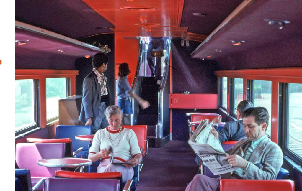 During Amtrak’s first decade of the 1970s, our own national passenger rail service was still cobbling together older railroad equipment from the earlier private luxury trains that once plied the nation (see image below). And the federal budget for maintaining a skeleton passenger network in the US was extremely tight. Trains were all but out, and cheaper auto and air travel were in. By necessity, everything got simplified, both on board and inside the makeshift cubical rail stations with — you guessed it — standard-issue plastic seating. In Panem’s case, we seem to be witnessing the transition from 1920s and 40s-era railroad travel featured in Songbirds and Snakes to more streamlined trains with cheaper decor some 40 years later. That said, we do not yet see the luxurious, high-speed trains from the original series that dart around Panem at 200 miles per hour. No, during the 50th Games our hapless tributes are still traveling on rather conventional railroad trains on steel rails that Americans would have recognized during the mid-to-late 20th century.